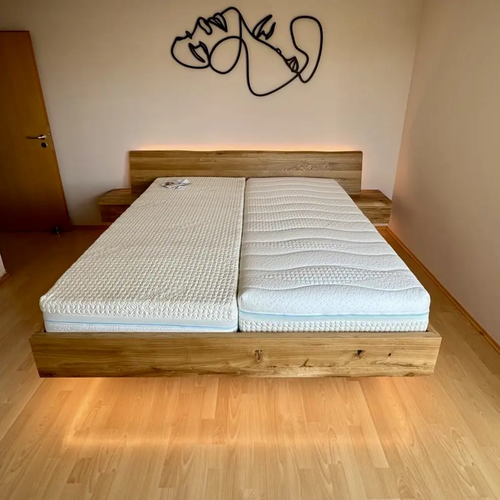 Wir durften hier ein schönes massives Bett aus Eichenholz liefern. Bei der Holzauswahl wurde auf eine „wilde“ Sortierung geachtet. Das heißt es darf auch der ein oder andere Ast mit drinnen sein. Am Kopfteil ist sogar noch die originale Baumkante zu sehen. So wie es aus dem Wald kommt.