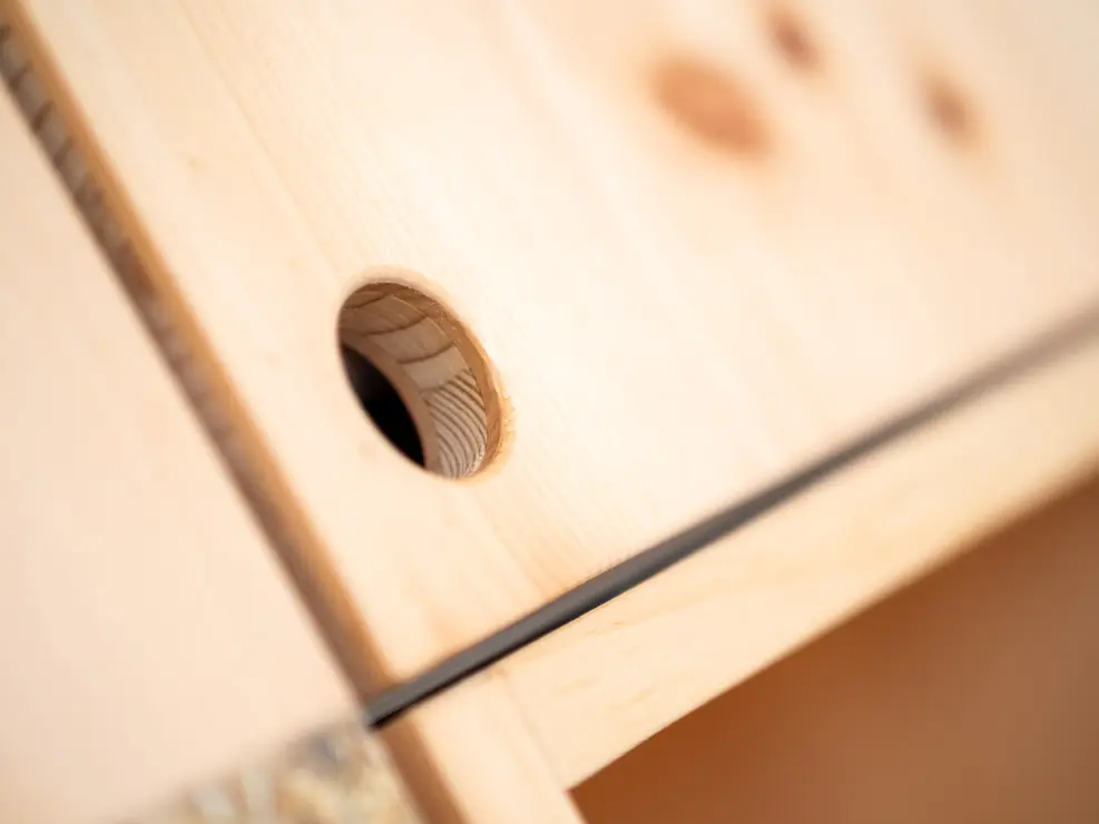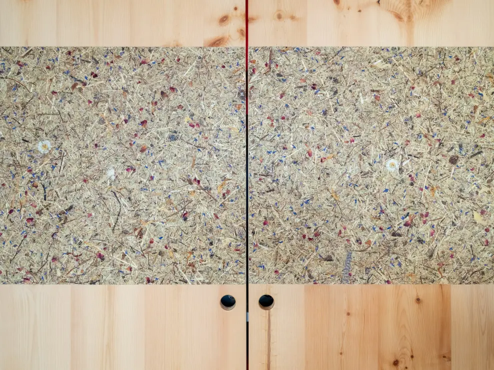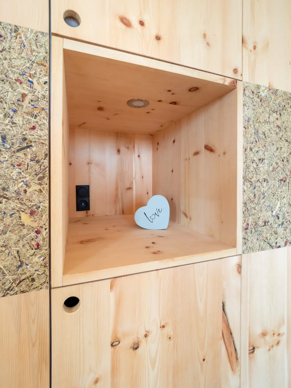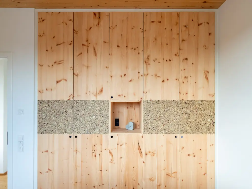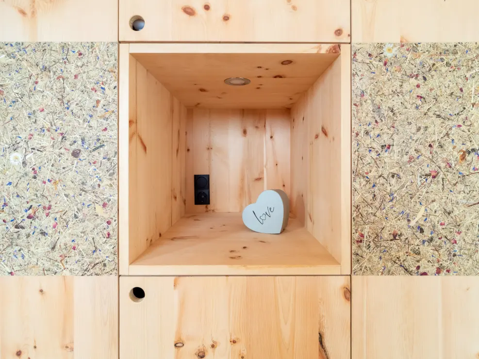 Der Einbauschrank besteht aus geschliffenem Zirben-Massivholz und wurde passgenau angefertigt – denn Martina wollte den Platz in ihrer Wohnung effizient nutzen. Neben den „Blumenwiesen“-Elementen haben wir als Griffersatz dezente Löcher als Grifföffnungen umgesetzt, die sich harmonisch ins Gesamtbild einfügen.