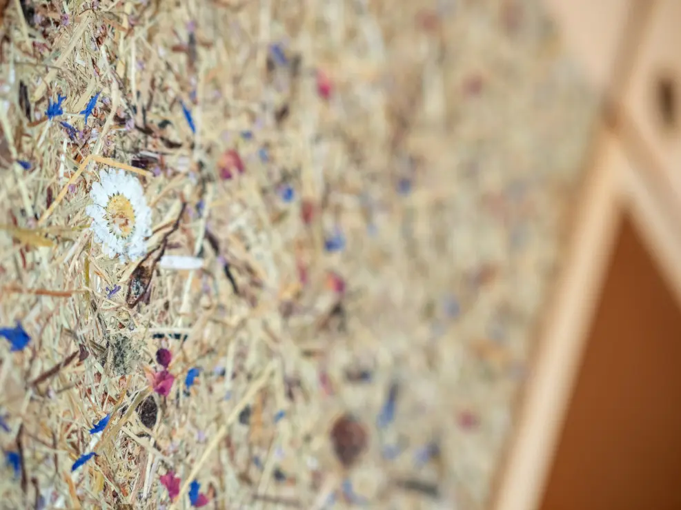 Ein besonderes Highlight ist die kleine Nische in der Mitte: Sie lockert die große Schrankfront auf und schafft Platz für Deko, Schmuck oder persönliche Lieblingsstücke. Zusammen mit den getrockneten Heublumen ist so ein echter Hingucker entstanden – und der großflächige Schrank wird zum zentralen Gestaltungselement im Raum.