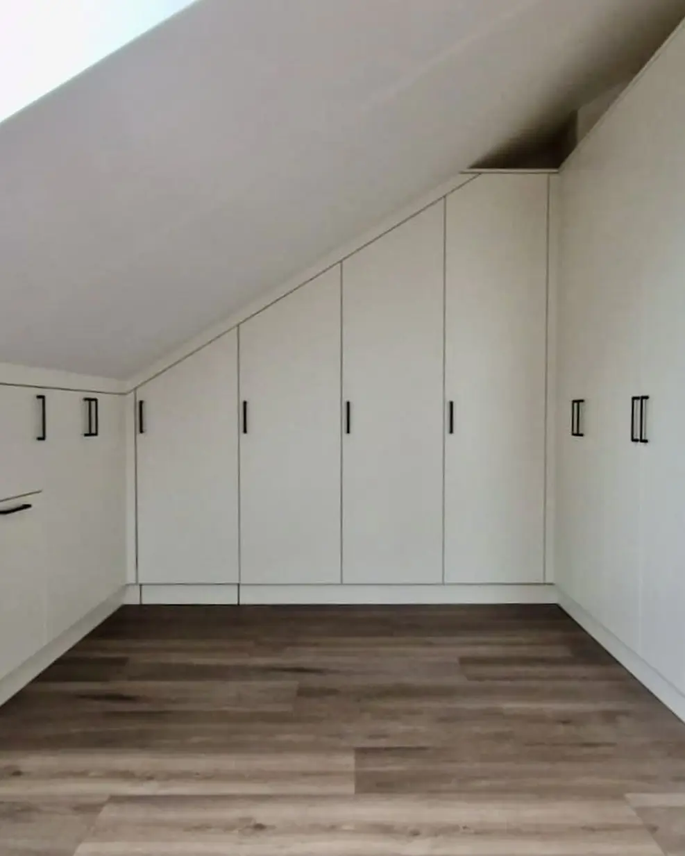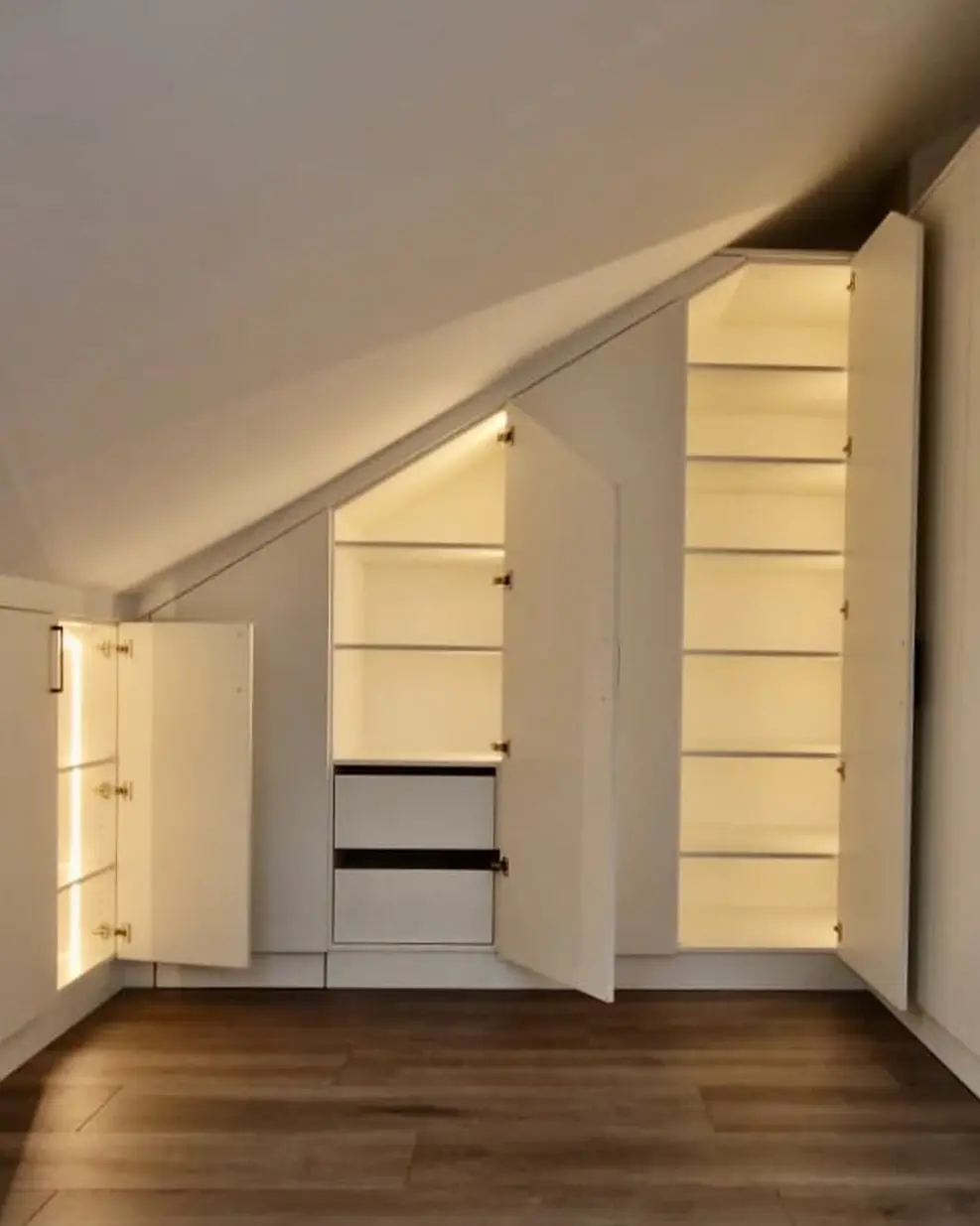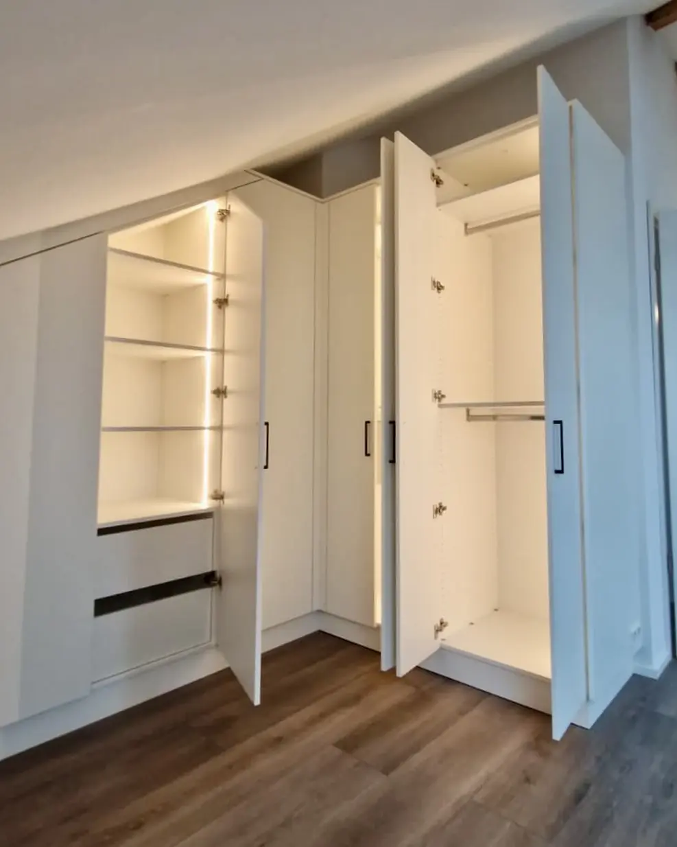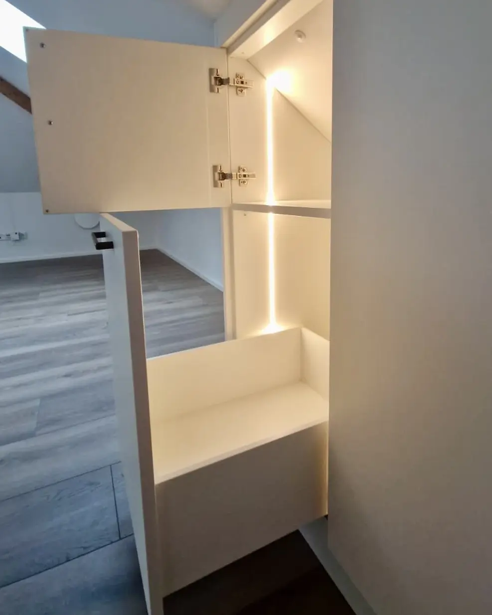 Die Dachschräge zu 100% ausgenutzt. Das Schaft der neue Einbauschrank im Dachgeschoss. Er bietet Platz für richtig viel Kleidung. Es ist auch Platz für einen Wäschekorb vorgesehen um die Schmutzwäsche zu sammeln. Innen sind LED- Strips flächenbündig eingefräst. Beim öffnen der Türen schaltet sich das Licht dank Bewegungsmelder ein und sorgt für einen Besseren Überblick.